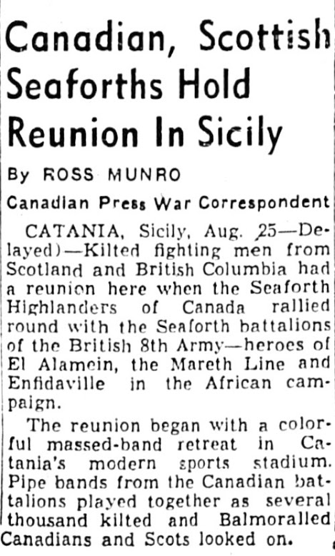Ross Munro strikes again, this time with a wee story out of Catania (delayed, from Aug. 25th), a large city situated at about the mid-point of Sicily's east coast. My father was likely there at about the same time, perhaps later in the week. Had he been there at the same time, surely he would have recalled the pipe bands and mentioned them in memoirs.