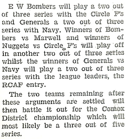 The Comox newspaper also shared information about many events that related in some way to a good-sized group of navy boys (RCNVR, and volunteers for Combined Operations) who served at the navy base on "The Spit" after two years of service overseas related to the Dieppe Raid and operations re the invasions of North Africa, Sicily and Italy. A good deal of information about those events can be found on this blog/website by visiting 'Dieppe, North Africa' etc., as found via "click on Headings" in right hand margin.