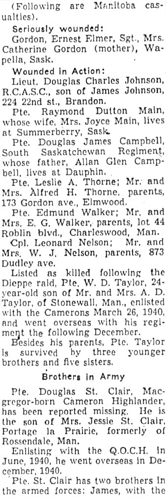 The Tribune (and other national and international newspapers) carried news about the Dieppe Raid and associated casualty lists for at least 1 - 2 weeks after the fateful raid took place on August 19, 1942. Readers can link to other news clippings I have collected here - Articles: Dieppe Raid 1942 (Rutter/Jubilee) Parts 1 - 9