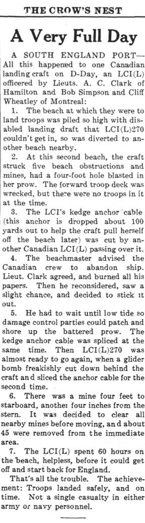 As I continue to comb The Crow's Nest, a Canadian Navy newspaper, I find good examples of 'the arts of war' produced by officers and ratings in the RCN and RCNVR. Occasionally I also find a gem of a photograph (like the one above!) or news article that directly or indirectly relates to my chief topic of interest, i.e., the 950 - 1,000 Canadians in Combined Operations.