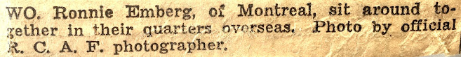 The wee clip at top of page signals that week by week in late 1943 and early 1944 members of the Canadian armed forces are returning home for a variety of reasons. Some are on leave before re-assignment, and some are nursing injuries, etc. Two or three of the fliers appear to be from Winnipeg, e.g., FO. D. W. Westcott. No photo accompanied the news item.